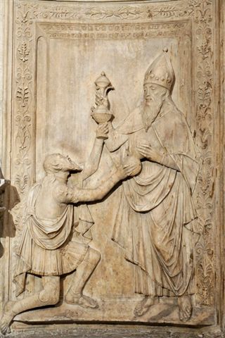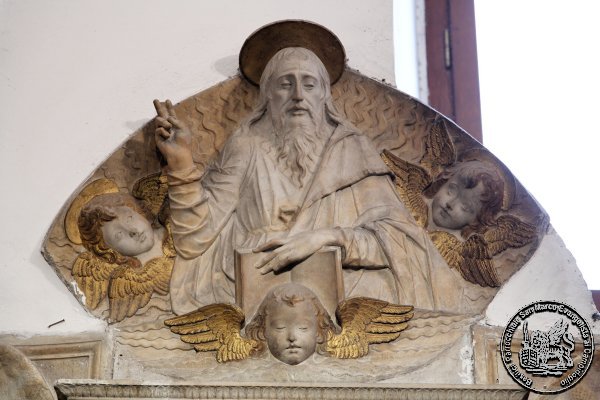 Mino da Fiesole , toscano, allievo del Rossellino e di Desiderio da Settignano realizza le sue opere attraverso una forte concisione volumetrica ed i suoi personaggi , per la maggior parte, sono posti di profilo onde evitare l’impatto rigido della visione centrale. In alto si nota l’Eterno Padre, a sinistra Giacobbe che riceve la primogenitura da Abramo , a destra Melchisedek che dà il pane ed il vino ad Abramo e al centro si notano due bellissimi angeli con le ali spiegate.